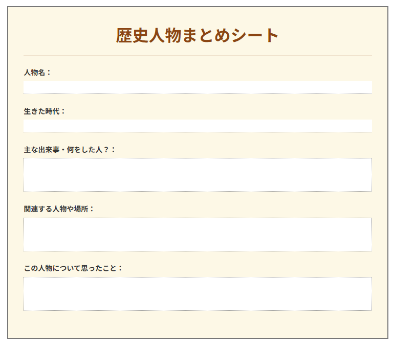 - テンプレート① 歴史人物まとめシート: 複数の人物を同じ形式でまとめることで、知識が整理しやすくなります。