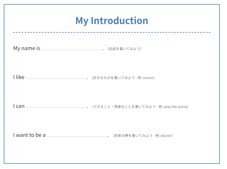 - 名前、好きなこと、得意なこと、将来の夢などを日本語で書き出す。